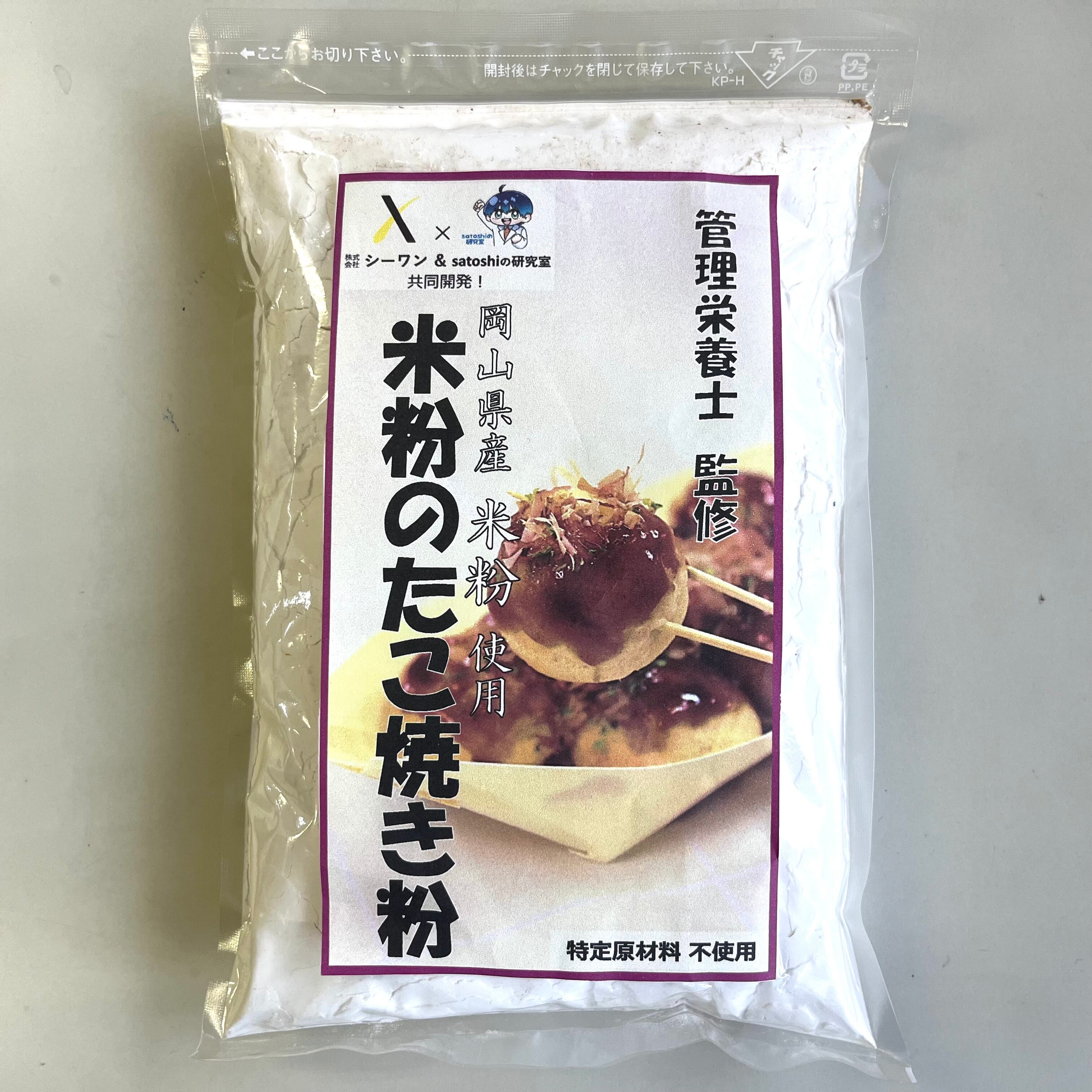 岡山県産の米粉をベースに、管理栄養士監修の独自配合でつくり上げた「米粉のたこ焼き粉」。グルテンフリーで体にやさしく、外はカリッ、中はとろっと仕上がる“失敗しにくい”のが特徴です。